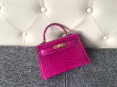 スポットエルメスミニケリー-2エルメスJ5アラビアンナイトピンクパープルシャイニークロコダイルスキンミニケリーバッグ2世代ゴールドバックル