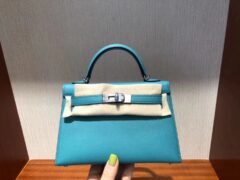 スポットエルメスミニケリーバッグエルメス輸入エプソムレザー8UグレイシャーブルーMinikelly22CMシルバーバックル