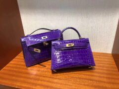 エルメスミニケリー2世代エルメス5Lエクストリームパープル光沢クロコダイルレザーミニケリーバッグゴールドバックル/シルバーバックル