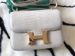 エルメスコンスタンス18CMエルメス8Pペンシルグレー光沢のあるクロコダイルレザースチュワーデスバッグゴールドバックル