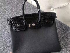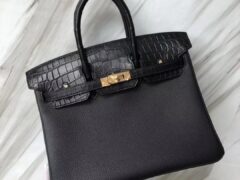 スポットエルメスタッチシリーズエルメスバーキン25CMブラックマットクロコダイルレザートーゴレザープラチナバッグゴールドバックル