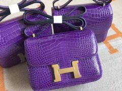 エルメススチュワーデスバッグサイズエルメスコンスタンス18cm9Gクリスタルパープルシャイニークロコダイルレザーゴールドバックル