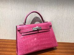 スポットエルメスミニケリー-2エルメス5Jピンクの光沢のあるクロコダイルレザーミニケリーバッグ2世代シルバーバックル