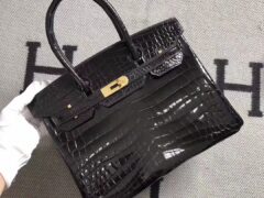 エルメスケリーバッグエルメスケリー28CM光沢のあるクロコダイルスキンケリーバッグブラックゴールドバックル