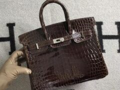 スポットエルメスバーキン25CMエルメスダークブラウンシャイニークロコダイルレザープラチナバッグシルバーバックル
