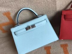 エルメスレディースバッグ価格エルメスミニケリー-2U2ブリーズブルーオリジナルパームグレインレザーミニケリーバッグクラッチシルバーバックル