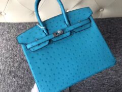 スポットエルメスバーキンレディースバッグエルメストップKKオーストリッチレザープラチナバッグBirkin25CM3Pマカロンブルーシルバーバックル