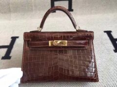 エルメスエルメスミニケリーバッグダークブラウンマットクロコダイルレザーミニケリー22cmゴールドバックル