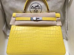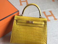 エルメスケリーバッグカスタムエルメスオリジナルマットクロコダイルレザーケリーレディースバッグ28CM9Rレモンイエローシルバーバックル