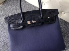 カスタマイズされたエルメスタッチシリーズエルメスディープシーブルーマットクロコダイルレザーとヤギレザーBirkin30プラチナバッグローズゴールドバックル