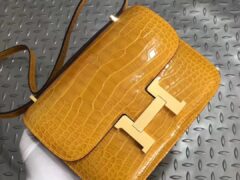 エルメスコンスタンス18CMエルメス9D琥珀色黄色の光沢のあるクロコダイルレザースチュワーデスバッグゴールドバックル